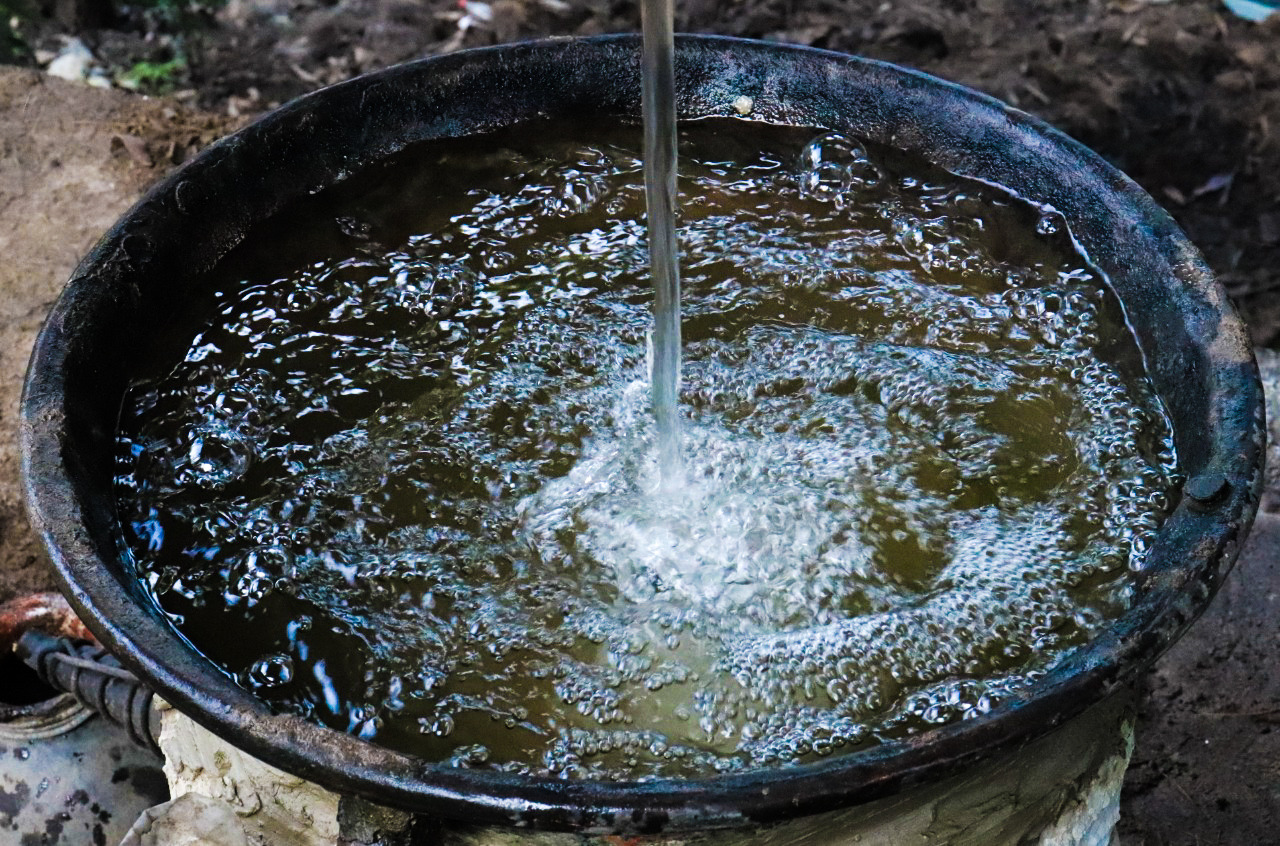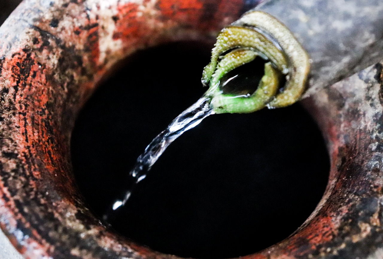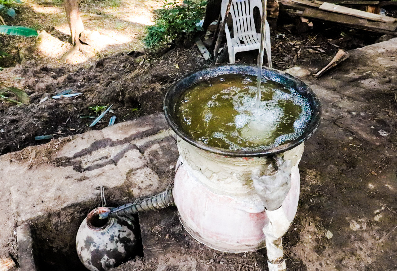 De repente, observo detenidamente la lluvia por mi ventana e imagino que el ciclo del agua es similar a la etapa de destilación del mezcal. El líquido se evapora de los océanos, el aire húmedo se enfría y se convierte en las gotas que forman las nubes, y que provocarán una precipitación. Así sucede en la destilación, donde hay una olla de cobre enterrada. Dicho utensilio, que contiene el jugo y la fibra del agave, recibe directamente el calor del horno de leña. Encima se coloca una olla de barro con la base descubierta y un cazo de cobre forrado con barro, que sirve como tapadera.