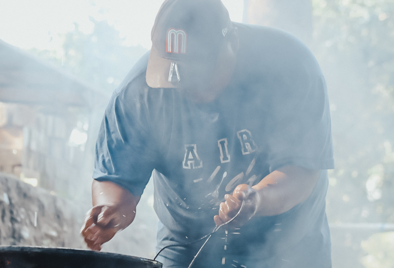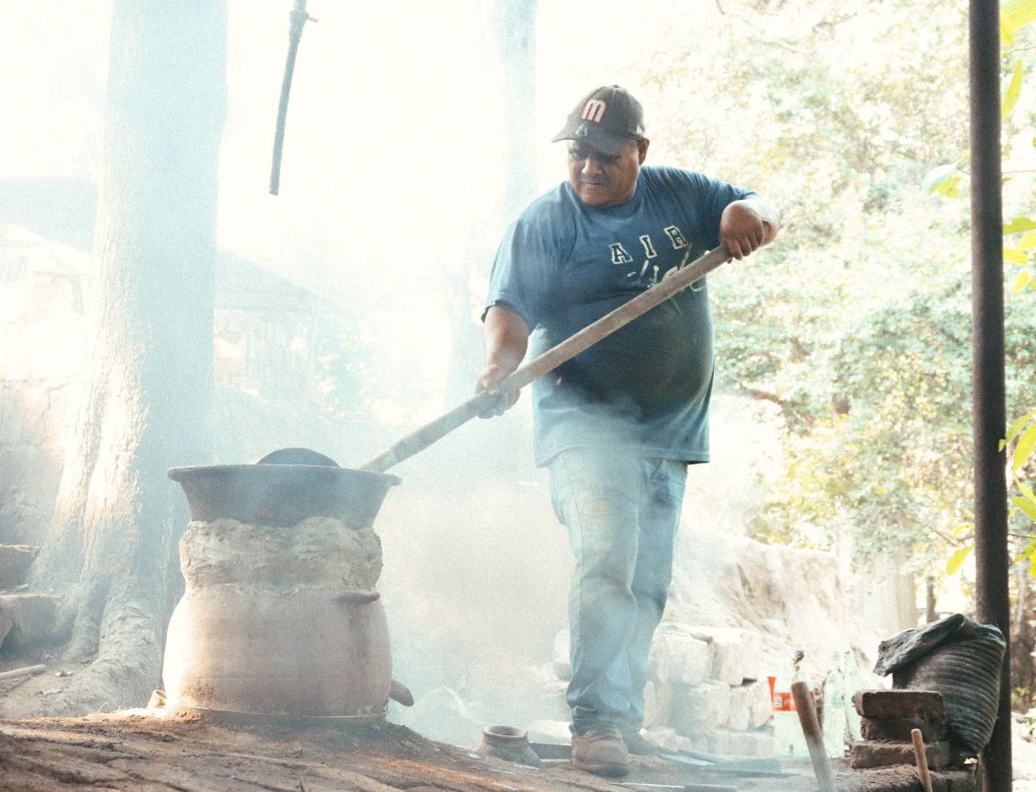 Una nube de humo blanco cubre al maestro mezcalero casi por completo. Baja rápidamente, se agacha y, sin interrupciones, pone más leña en el horno, la acomoda y el fuego hace su labor. Está en marcha la primera destilación. Se necesitan dos barricas de fibra de mezcal y tres barricas de jugo, equivalentes a 70 litros. El resultado final son 15 litros de mezcal con una graduación alcohólica de 25 a 28 grados.