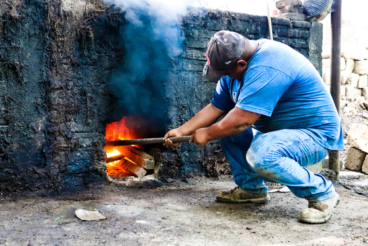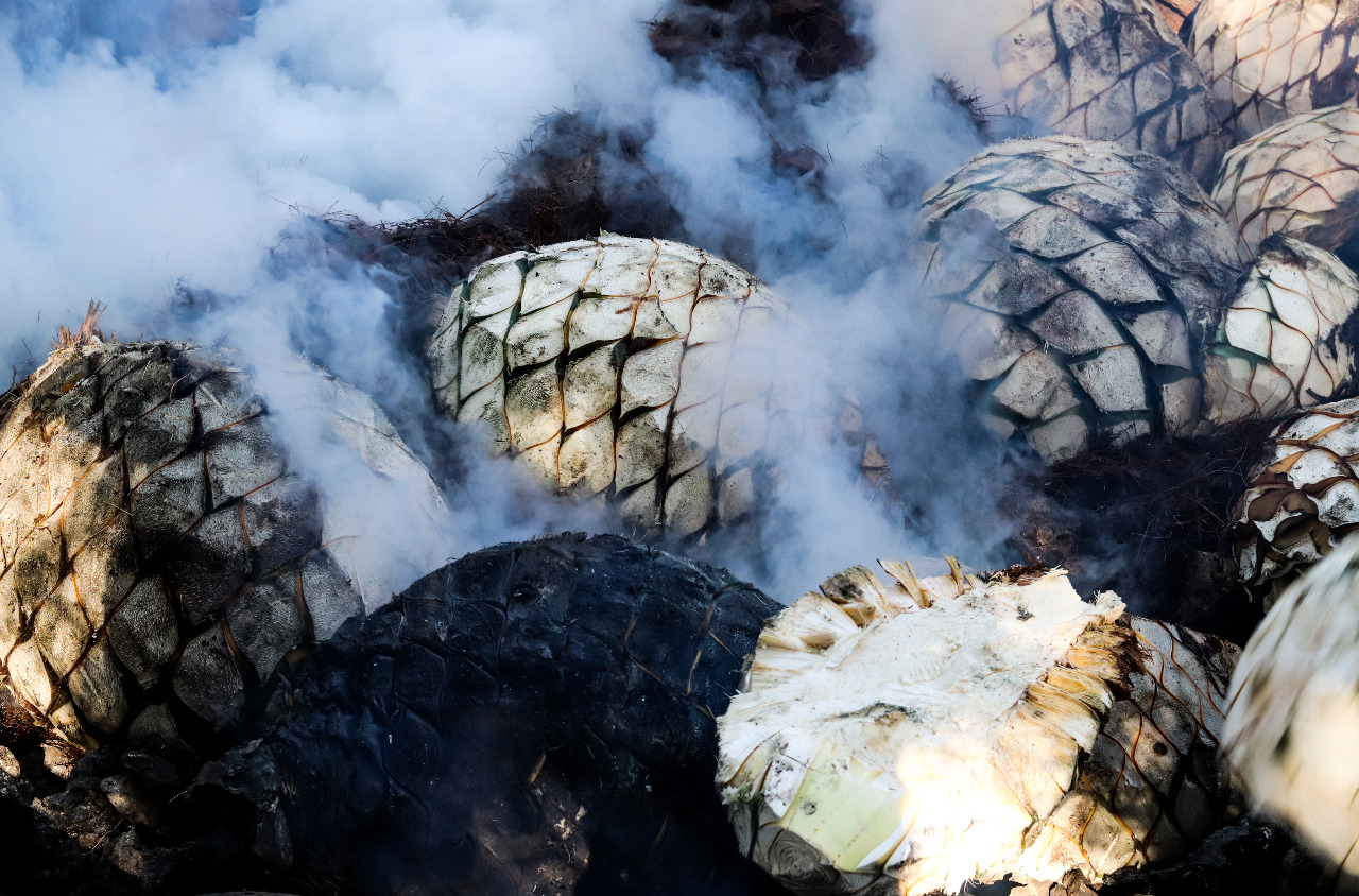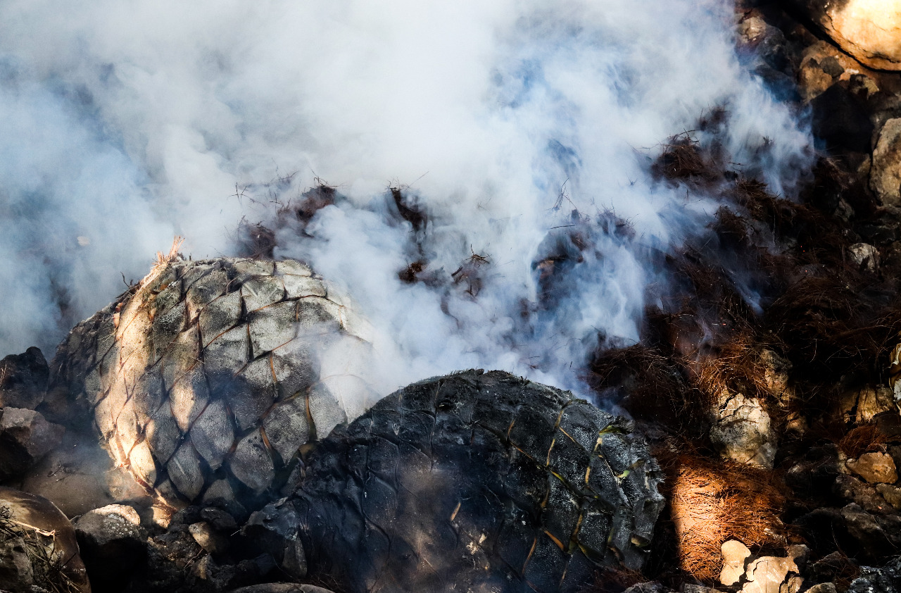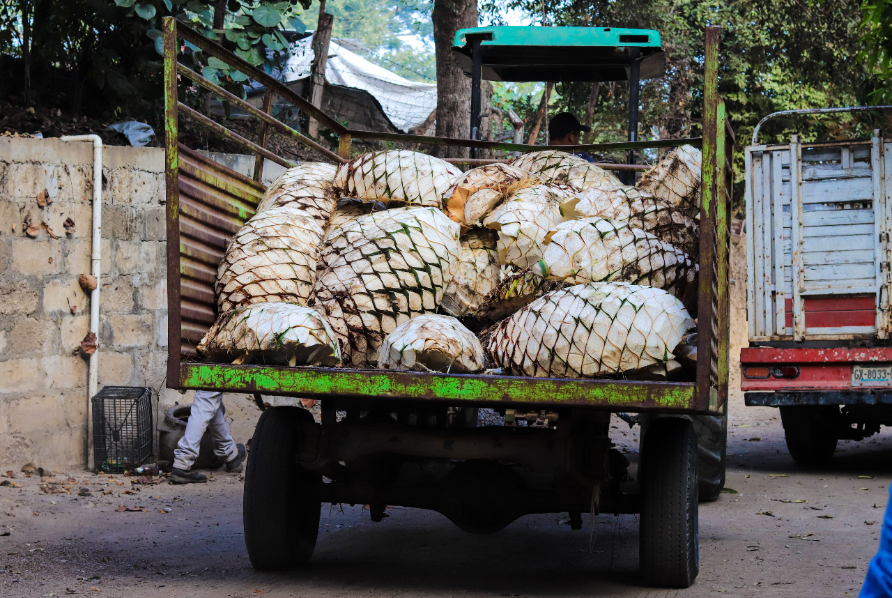 “Ponemos una tonelada de leña y conforme sube la flama vamos echando las piedras volcánicas o de río. Esperamos alrededor de 12 o 14 horas para que la leña este completamente rendida y tenga una flama no muy fuerte. Pasamos a taparlo, colocamos alrededor de las piedras cuatro o cinco toneladas de agave, lo acomodamos y arropamos con una capa de zacate y un nylon para que el vapor no se escape y tenga más calor. Ponemos una lona y la tierra. Ahí lo dejamos entre cuatro o cinco días, lo sacamos y nos ponemos a triturarlo… majarlo con una picadora mecánica”.