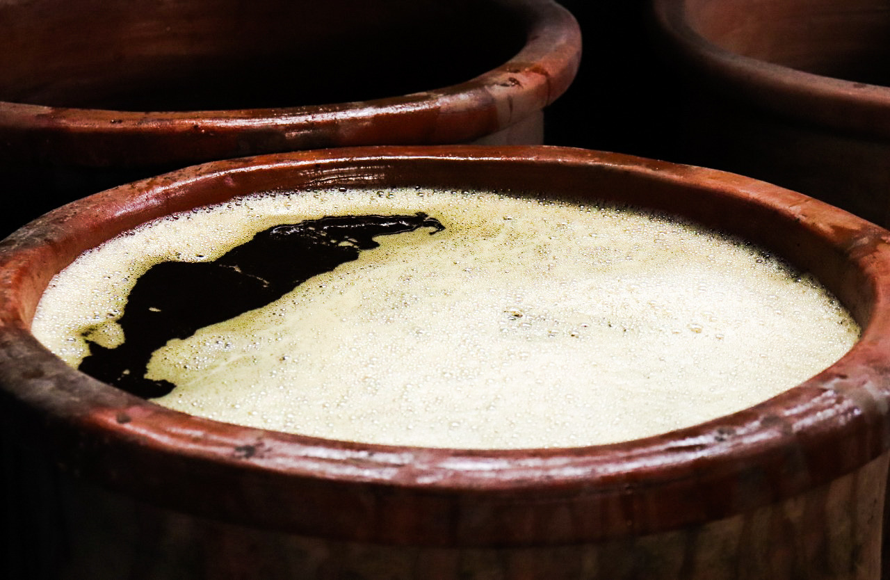 El proceso de fermentación tarda de 10 a 12 días en finalizar. Arturo lo realiza en una pila de piedra, ¿por qué? A diferencia de las tinas de madera que usan en Oaxaca, la piedra no suelta sabor u olor; de esta manera, la dulzura del mezcal se conserva. Arturo tiene dos hijos: Esaú es el mayor, tiene unos 14 años, con ayuda de un trinche o “pala de ganchos” retira el gabazo o la fibra del fermento. Vacía el jugo, o mosto (que es un líquido rojizo, casi naranja) a un par de cubetas. Entretanto, Arturo recuerda la primera vez que llevó a su hijo al campo a caminar por los agaves y sentir de cerca la tierra que los vio nacer: