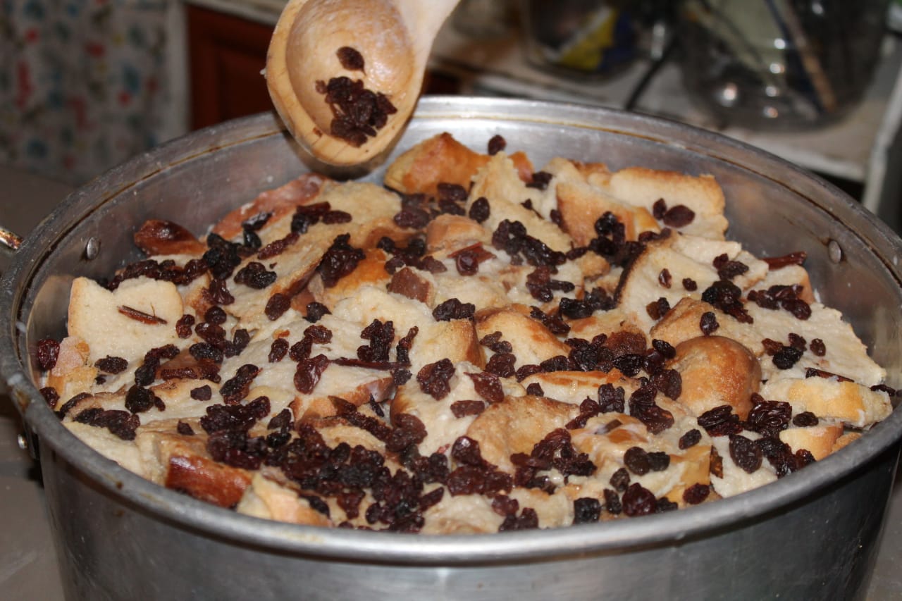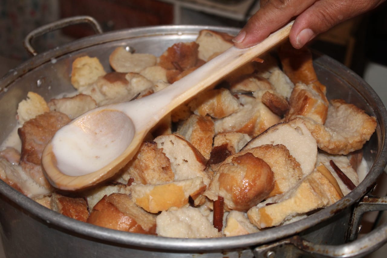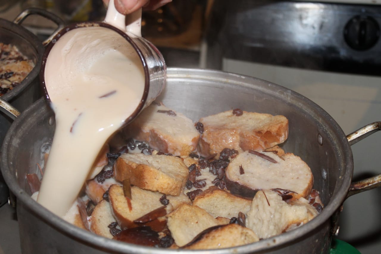 «Para preparala yo inicio hirviendo la leche con canela, azúcar, un poco de vainilla y una lata de leche Nestlé. En un molde se acomoda todo el pan. Después se va agregando una capa de pan, de pasas, almendras y se termina con la capa de leche hirviendo para que se remoje, y así, sucesivamente se va haciendo capa por capa hasta llegar al final. Después se mete a hornear durante una hora.»