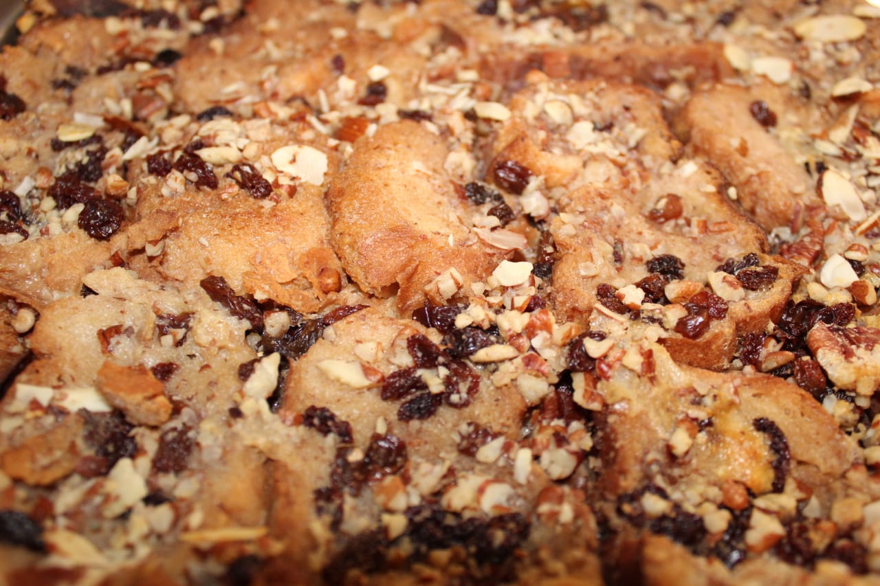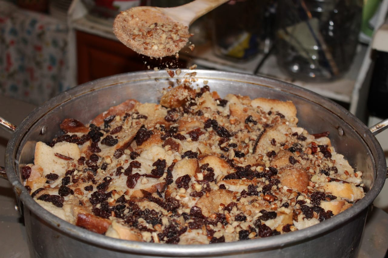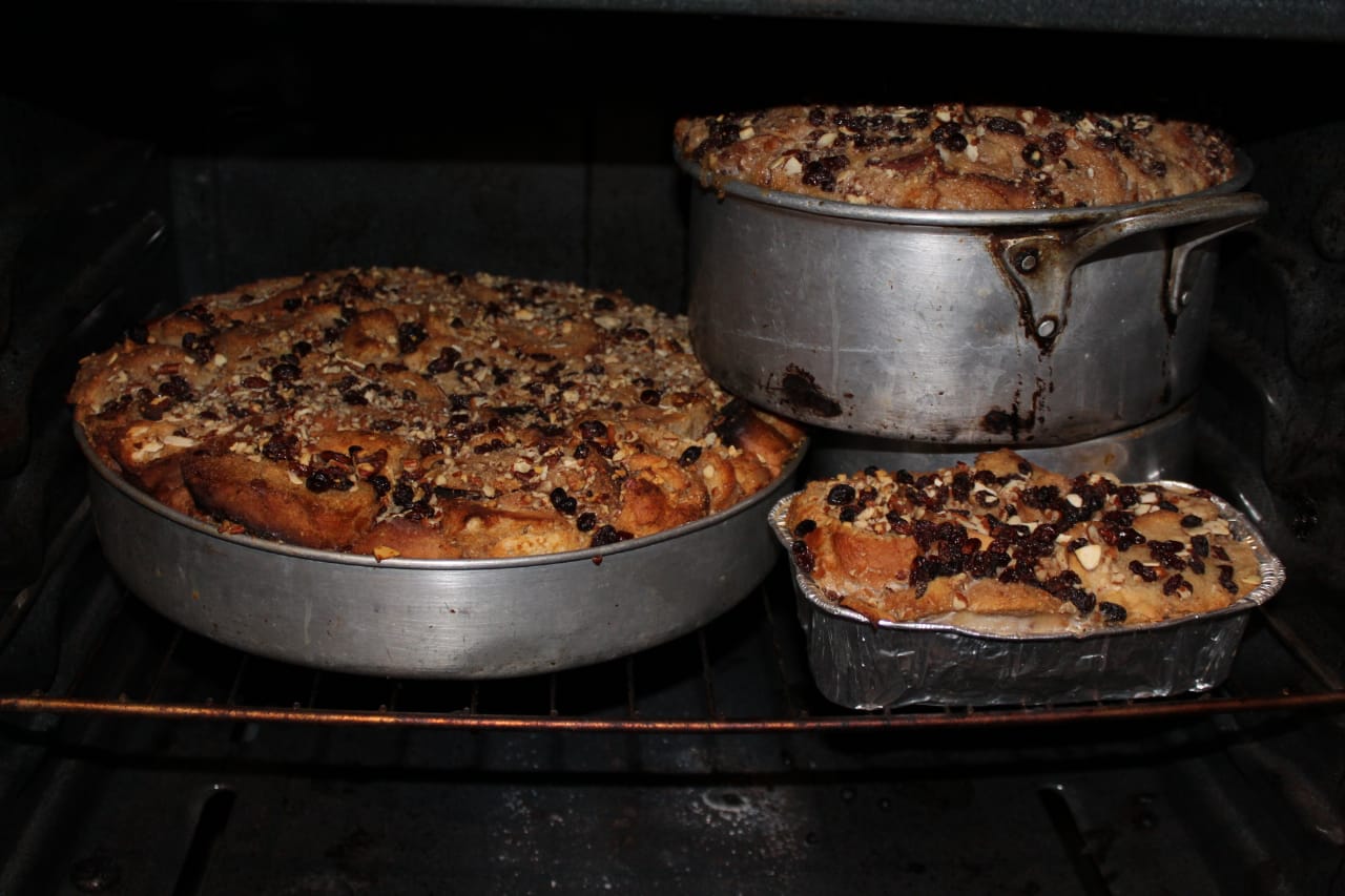 «Para preparala yo inicio hirviendo la leche con canela, azúcar, un poco de vainilla y una lata de leche Nestlé. En un molde se acomoda todo el pan. Después se va agregando una capa de pan, de pasas, almendras y se termina con la capa de leche hirviendo para que se remoje, y así, sucesivamente se va haciendo capa por capa hasta llegar al final. Después se mete a hornear durante una hora.»