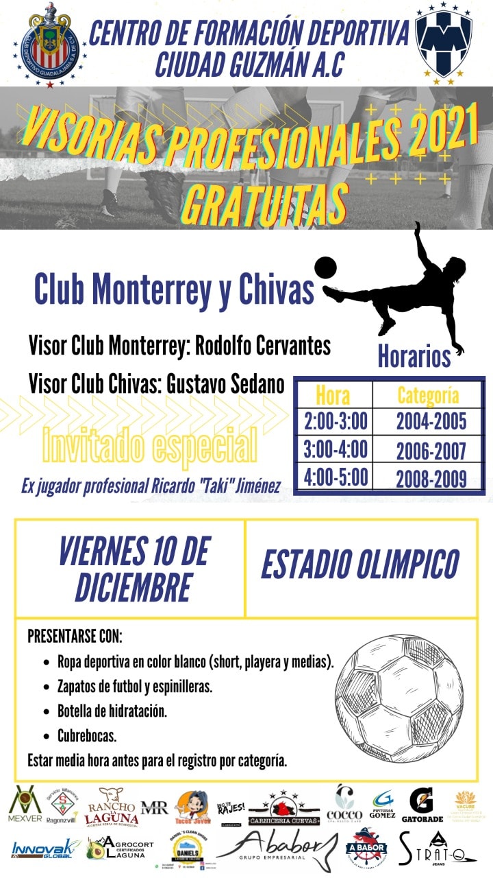El Centro de Formación Deportiva Ciudad Guzmán prepara visorías de futbol profesional para este viernes 10 de diciembre. En el Estadio Olímpico de Ciudad Guzmán estarán, a partir de las 2 de la tarde, los clubes Chivas y Monterrey para ver el talento zapotlense y del sur de Jalisco.