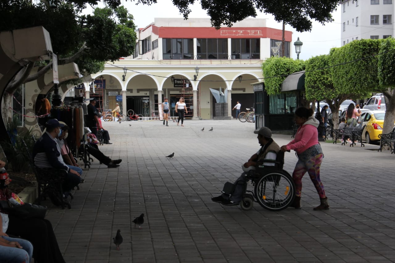 Algunos comerciantes, como el señor don Robert, como le llama la gente, vive de vender nieves en su carrito a un lado de la catedral de la ciudad y consigo carga su gel antibacterial y cubrebocas.