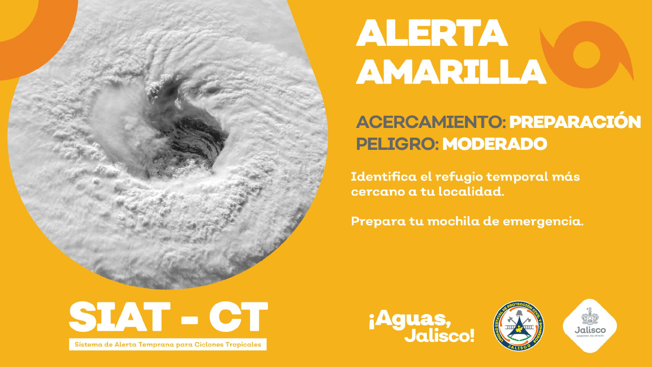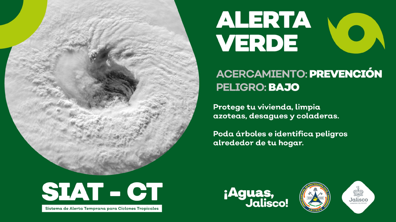 El Sistema de Alerta Temprana para Ciclones Tropicales de Protección Civil del Gobierno Federal, estableció alerta azul para el Sureste de Jalisco, verde para el Centro y alerta amarilla para el Suroeste y Noroeste de la entidad.