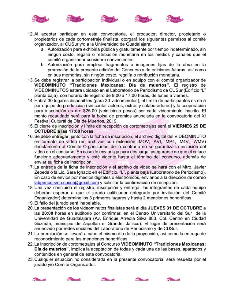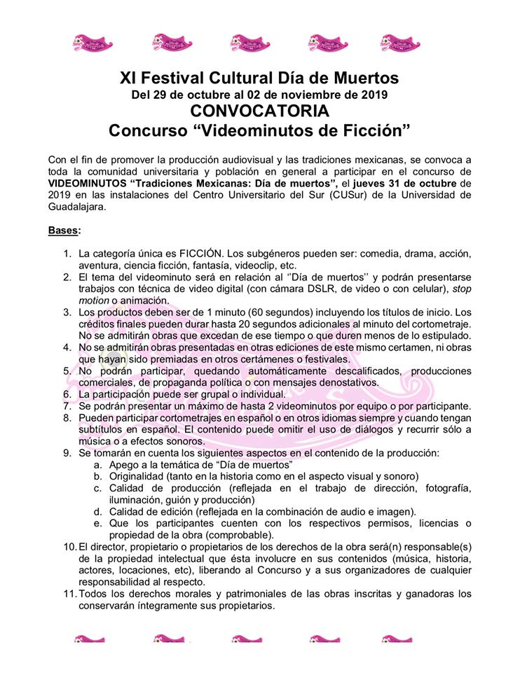 El Centro Universitario del Sur ya prepara la edición de este año del Festival de Día de Muertos que tendrá lugar del 29 de octubre al dos de noviembre. Una de las actividades que tendrán, será un concurso de videominutos llamado «Tradiciones Mexicanas: Día de Muertos», a realizarse el jueves 31 de octubre. Para esto, por medio del Laboratorio de Periodismo, abrieron una convocatoria para participar.
