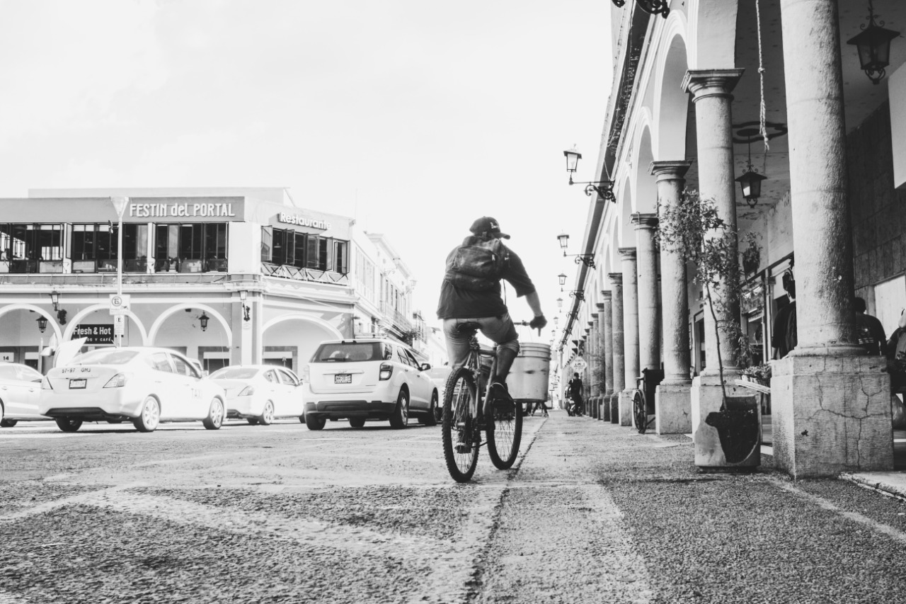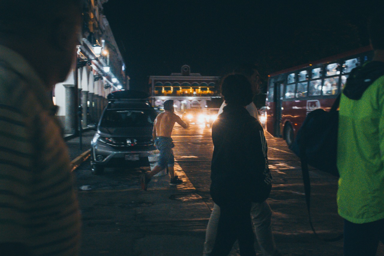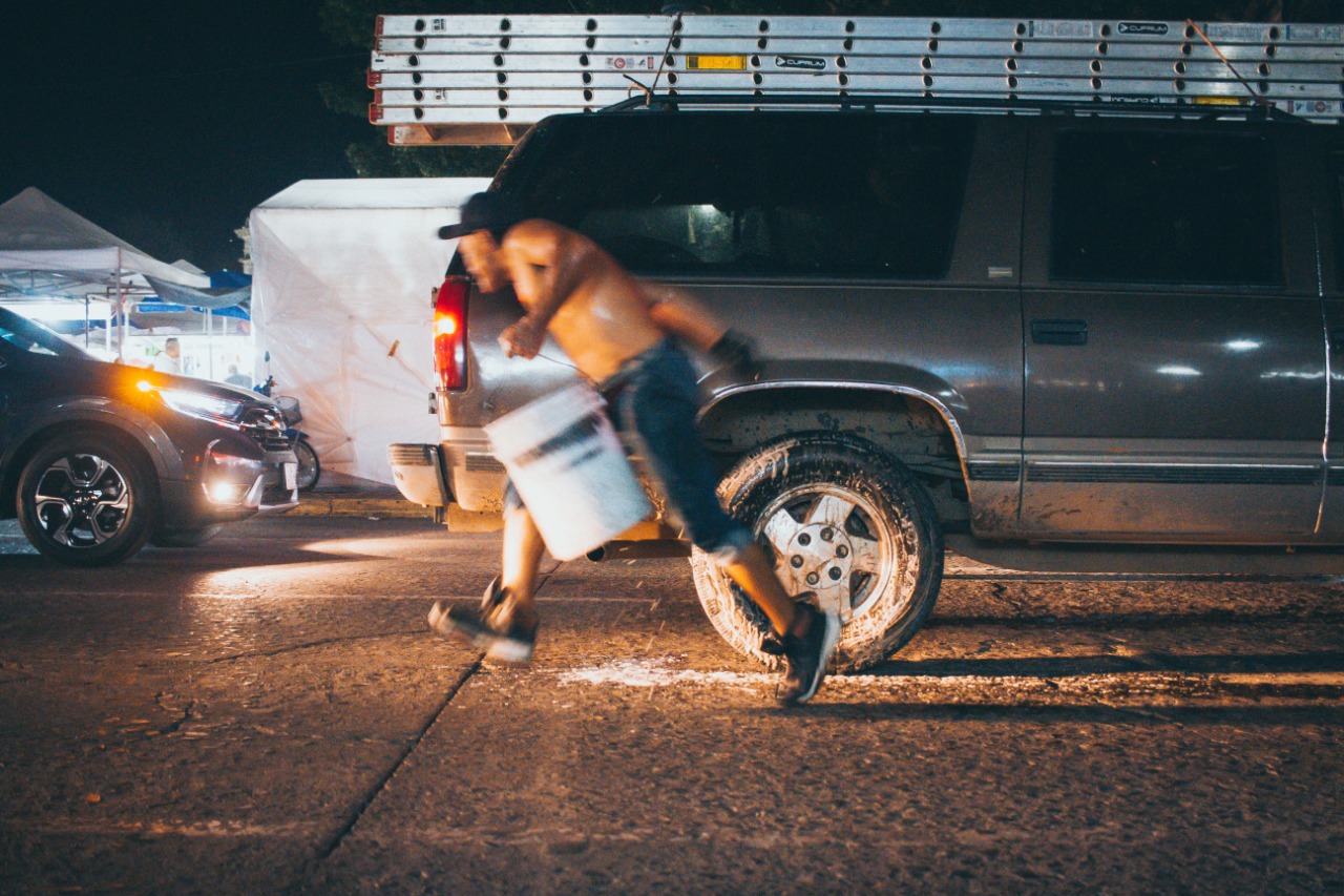 Son las 11 de la noche, Sergio ya terminó de trabajar. Está obscuro y las calles ya están vacías, pasan pocos coches y las personas ya se fueron. Bajo las luces, éste vacía la poca agua que queda de sus cubetas, guarda todo en ellas, se pone su playera y monta su bicicleta. Y comienza a pedalear por la calle Federico del Toro rumbo hacía el sur, va a su casa.