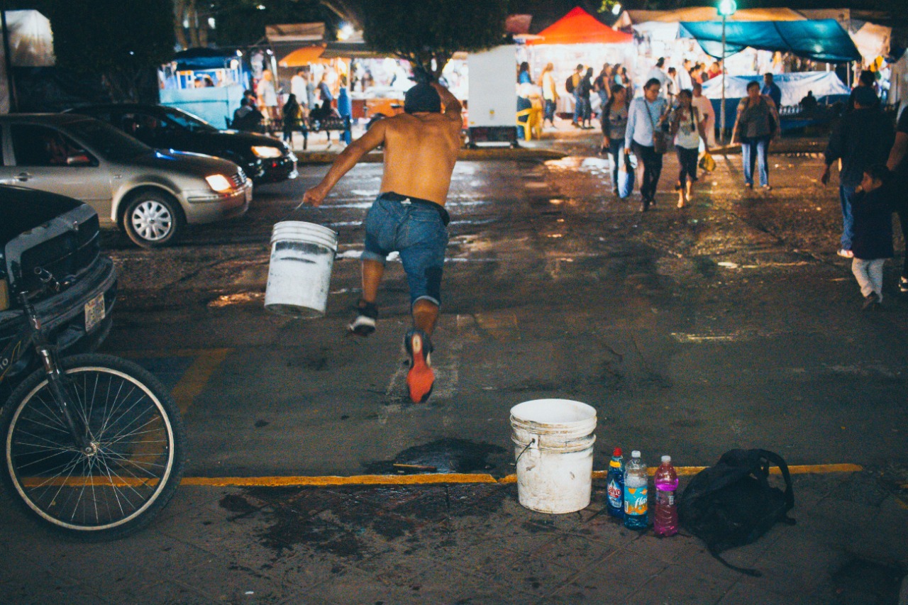 Son las ocho de la noche, Sergio está haciendo ejercicios de calentamiento a la par de que prepara sus cosas. Como si fuera a competir para una prueba olímpica, las calles del centro de Ciudad Guzmán (Zapotlán El Grande, Jalisco) son su arena de entrenamiento. Por su torso desnudo se deslizan gotas de líquido que van cayendo al suelo con el ritmo de sus brincos y movimientos, no es sudor, es el agua de la fuente con la que se moja para mantenerse fresco.