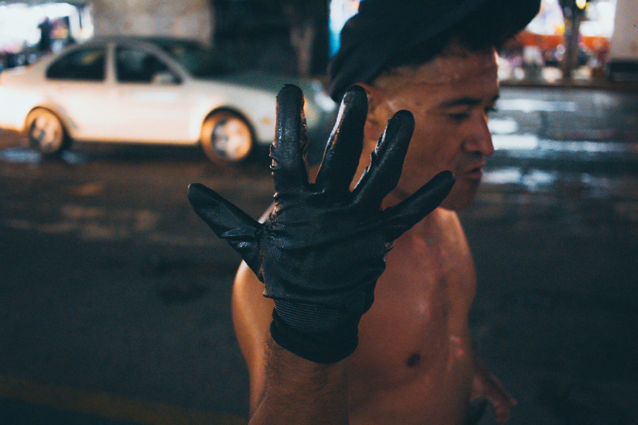 Mientras el semáforo está en verde, Sergio sigue brincando y haciendo ejercicios de calentamiento; cuando el semáforo cambia a rojo, el cronómetro inicia y entre la multitud que cruza la avenida sale disparado hacia un automóvil que elige al azar. Los 60 segundos que otorga el semáforo en rojo bastan para que lave las cuatro llantas. Sergio es conocido como “El rey de las llantas”.