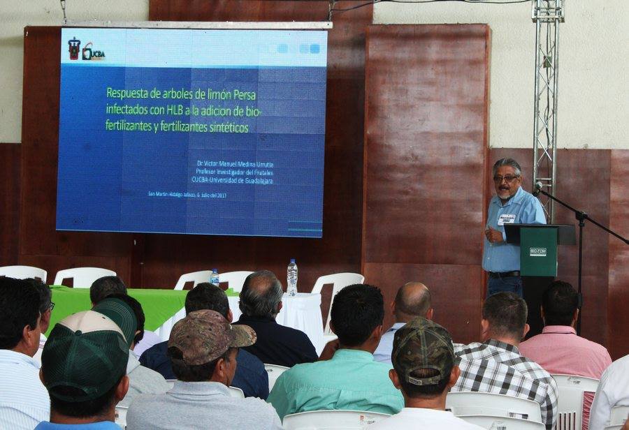 San Martín Hidalgo, Jalisco, fue sede del foro “Experiencia de tres años de Bio Fertilización en Limón Persa”. El programa de actividades contó con conferencias tales como «Perspectivas del Limón Persa en Jalisco», a cargo del Técnico Ildefonso Camacho, y «Comparación para la fertilización convencional vs. Bio Fertilización en el crecimiento, rendimiento, calidad de fruta e incidencia de HLB en Limón Persa», impartida esta por el dr. Víctor Manuel Medina Urrutia experto en fruticultura del Centro Universitario de Ciencias Biológicas y Agropecuarias de la Universidad de Guadalajara.