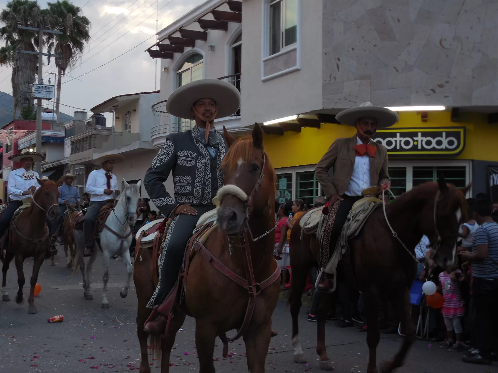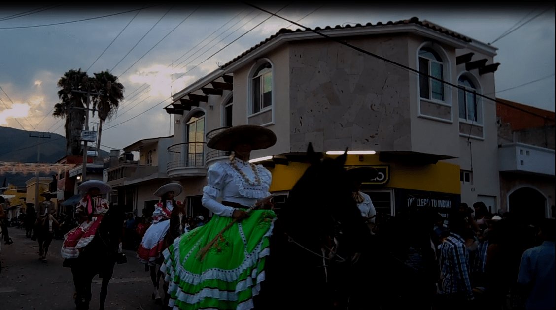 Detrás de ellos, el actor principal de la noche, el Sr. Del Perdón, adornado por el paisaje del día: el cerro del Cihuapilli detrás de él, el sol que comenzaba a ocultarse tiñó el cielo con tonos rosados, naranjas y morados que le dieron un toque más al día. Las danzas, lo charros, y los caballos salieron a relucir detrás del trono.