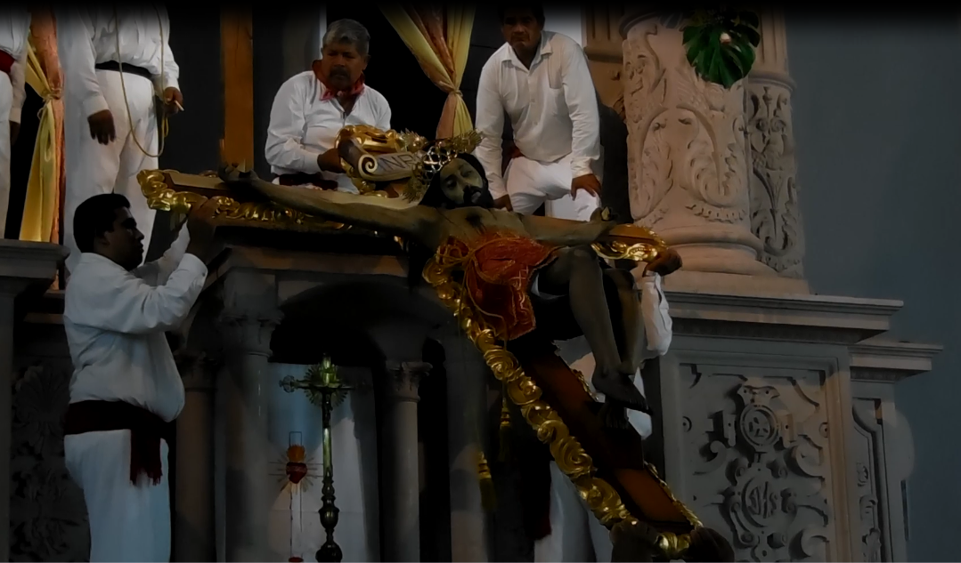 El señor Cura, inició “purificando el lugar” con sahumerios y rodeando del mismo a Juanita López Silva, representante de la familia que tuvo la mayordomía 2014- 2015. El aroma a copal y hojas de laurel llenaban el lugar. La chirimía y el Tecciztli (caracola) sonaban anunciando el descenso de la imagen.