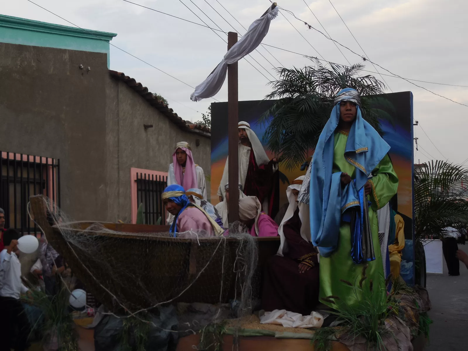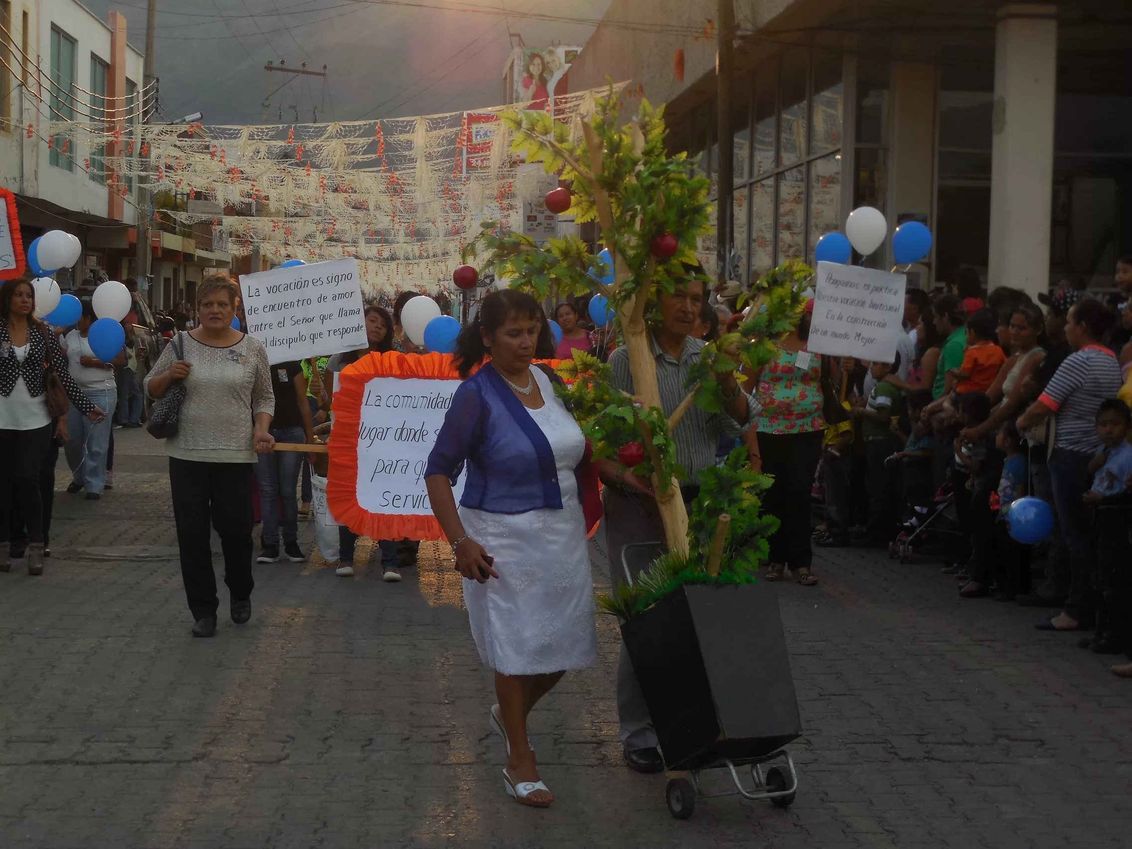 Más tarde, se comenzó a preparar la urna para colocar en ella al Santo que daría su recorrido anual, sin embargo, la salida de este se detuvo, ya que alrededor de las 5:30 de la tarde el cielo se nubló y comenzó a caer una llovizna ligera; al detenerse esta, el sol volvió a iluminar el cielo, y acercándose las 6 de la tarde, encabezando el recorrido, los carros alegóricos comenzaron a salir, con sus respectivos acompañantes, así como la música.