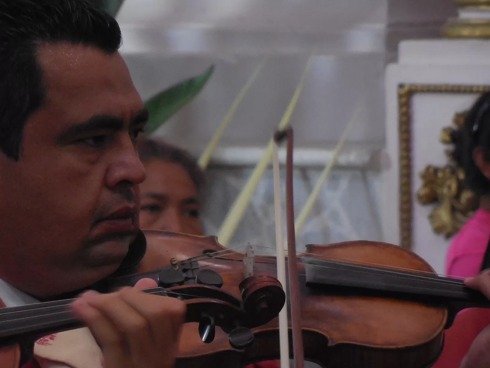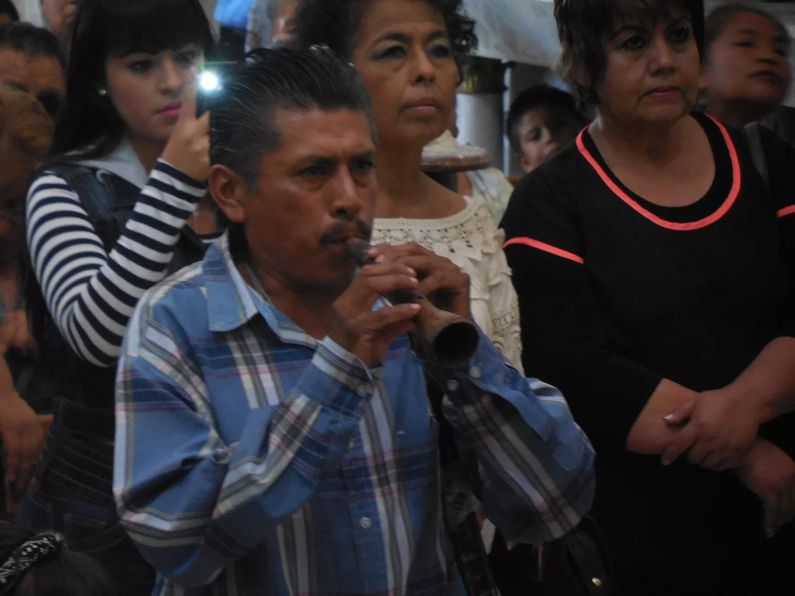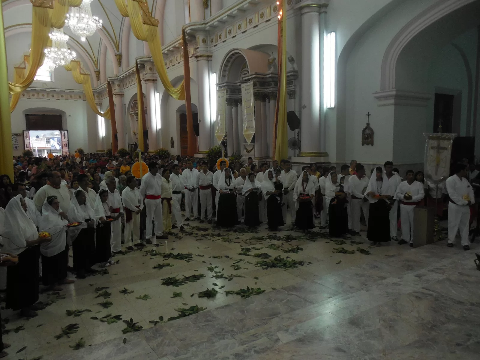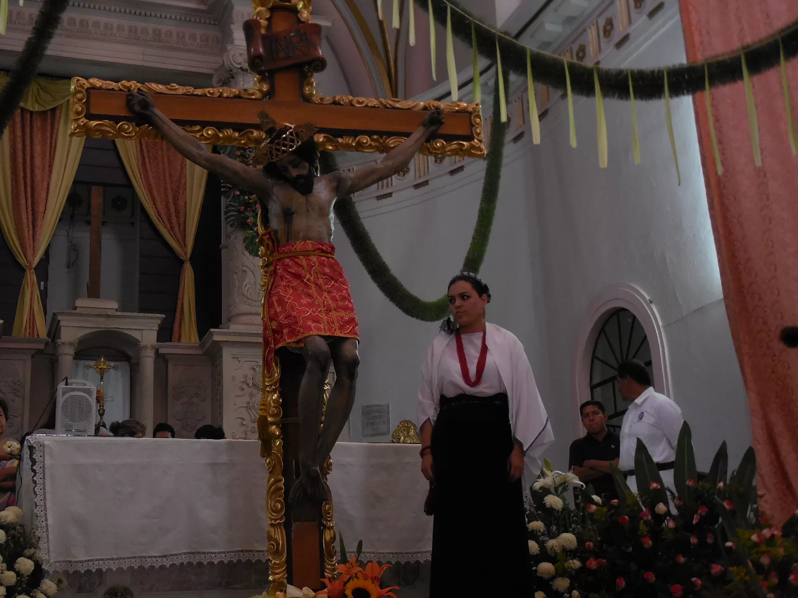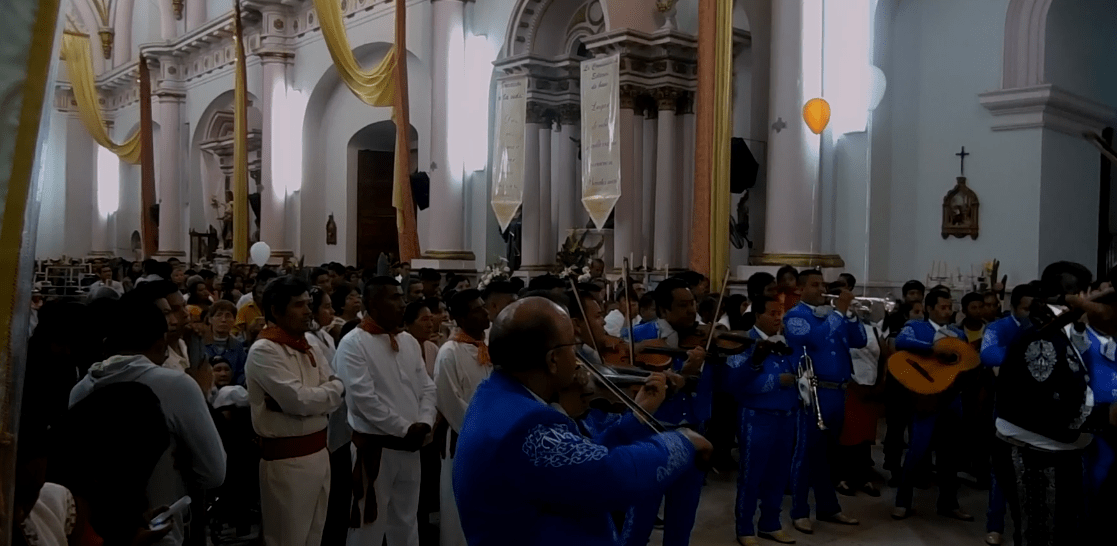 El mariachi se intercalaba con las mujeres que rezaban para no obstruir las oraciones. A la 1 de la tarde aproximadamente entró por la puerta principal la chirimía, acompañada por el tambor que seguía el rimo de esta, la gente se puso de pie, para después proseguir con las plegarias.