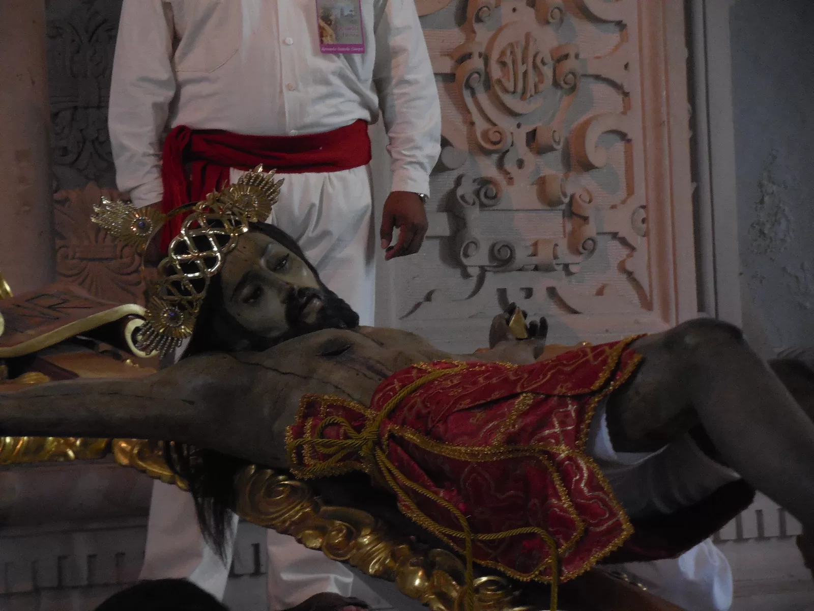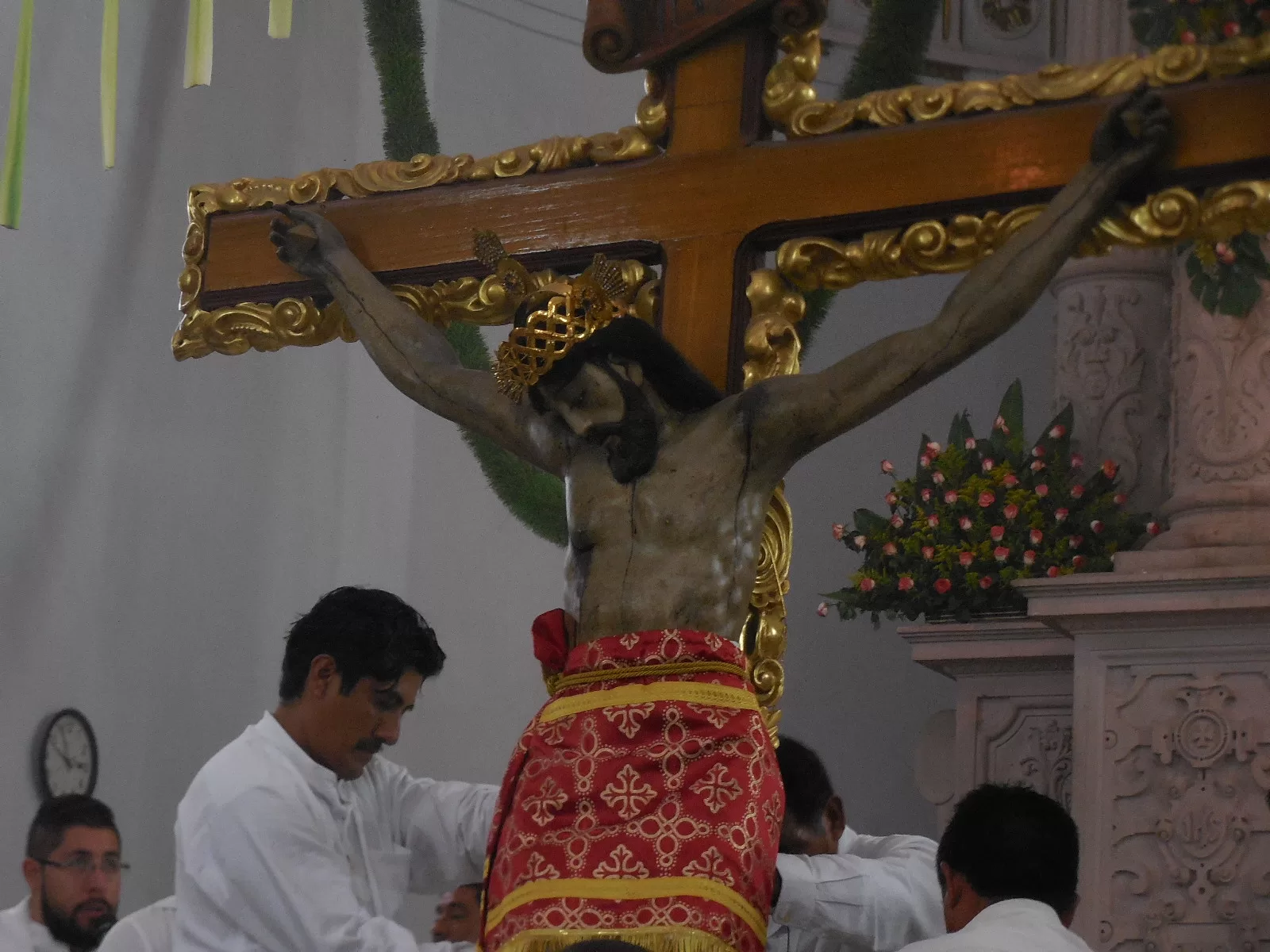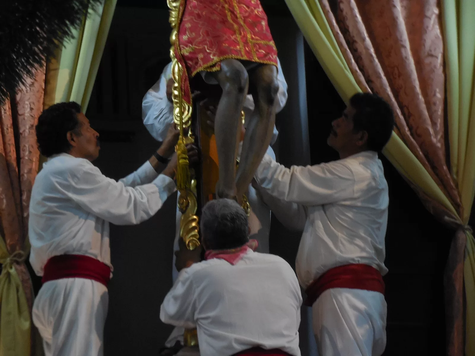 Anunciado con la tradicional chirimía, se supo que el Santo Patrono iba a entrar al lugar. Una urna transparente se hizo ver a la distancia, cargado por hombres fue bajada del trono y colocado en un arnés, donde poco a poco se fueron retirando las piezas.