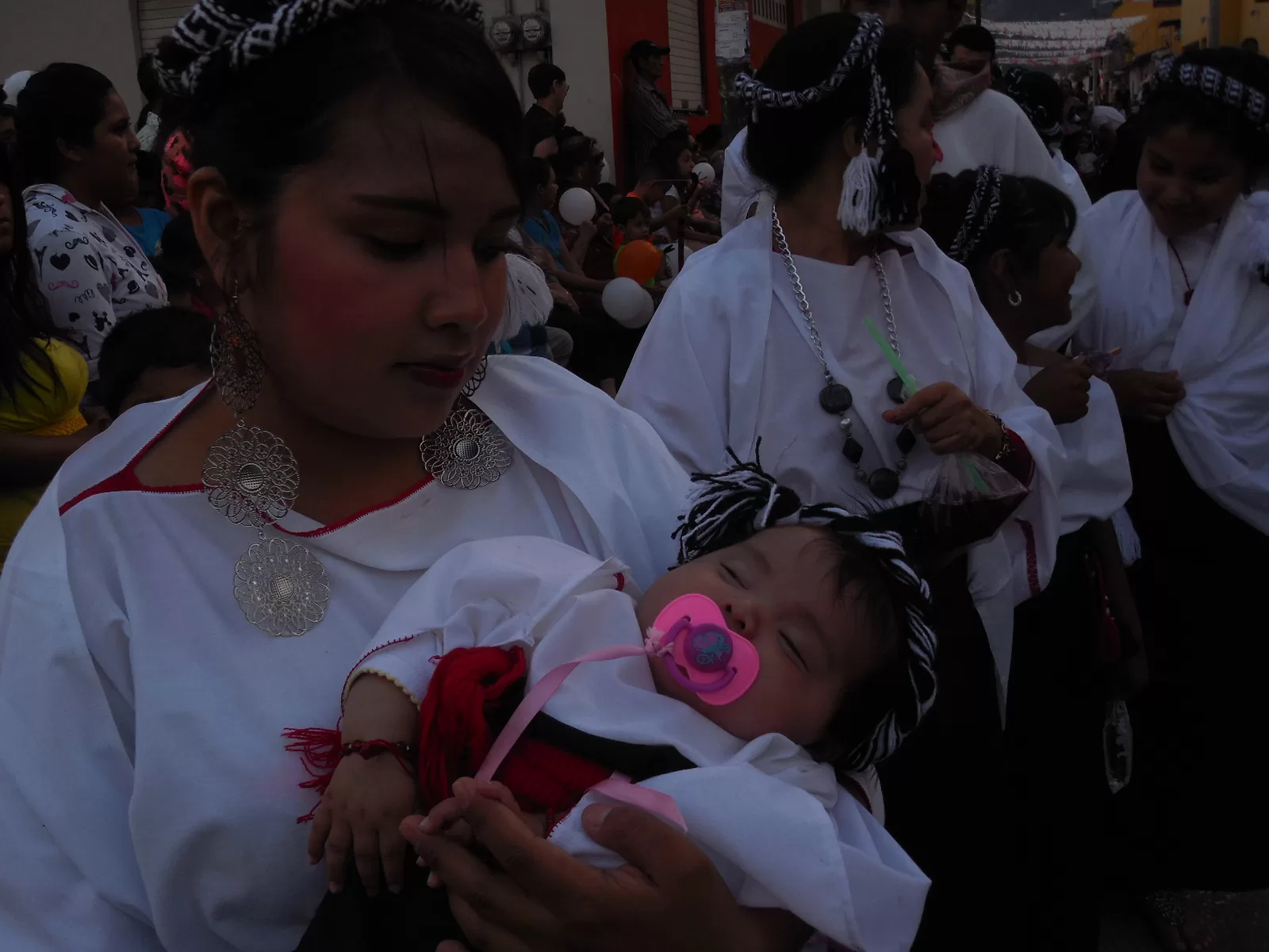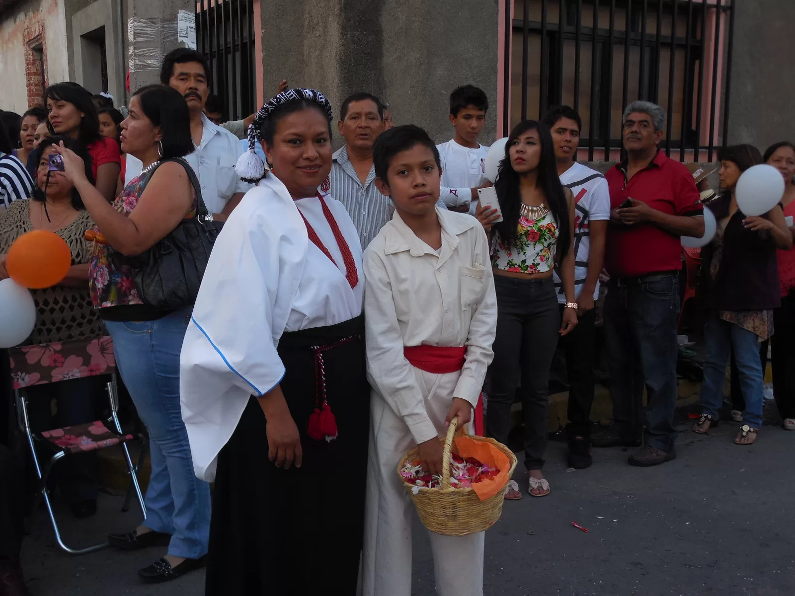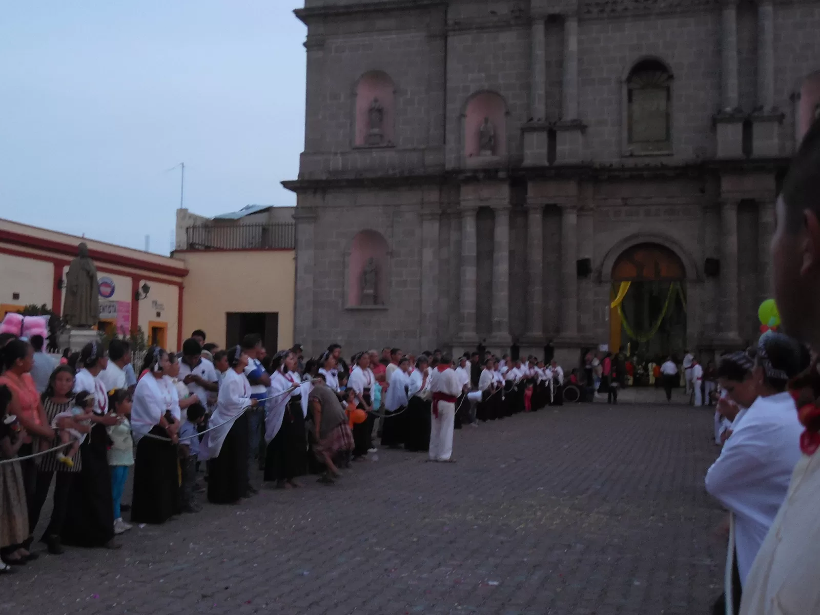 Le siguieron las mujeres que portaban su sabanilla negra, su blusa blanca, sus maztahuil y jolotones, mientras que los hombres llevaban su calzón blanco, su faja roja, al igual que los paños que rodeaban sus cuellos, ellos resguardando a la imagen se colocaron en dos líneas en los extremos de la calles.