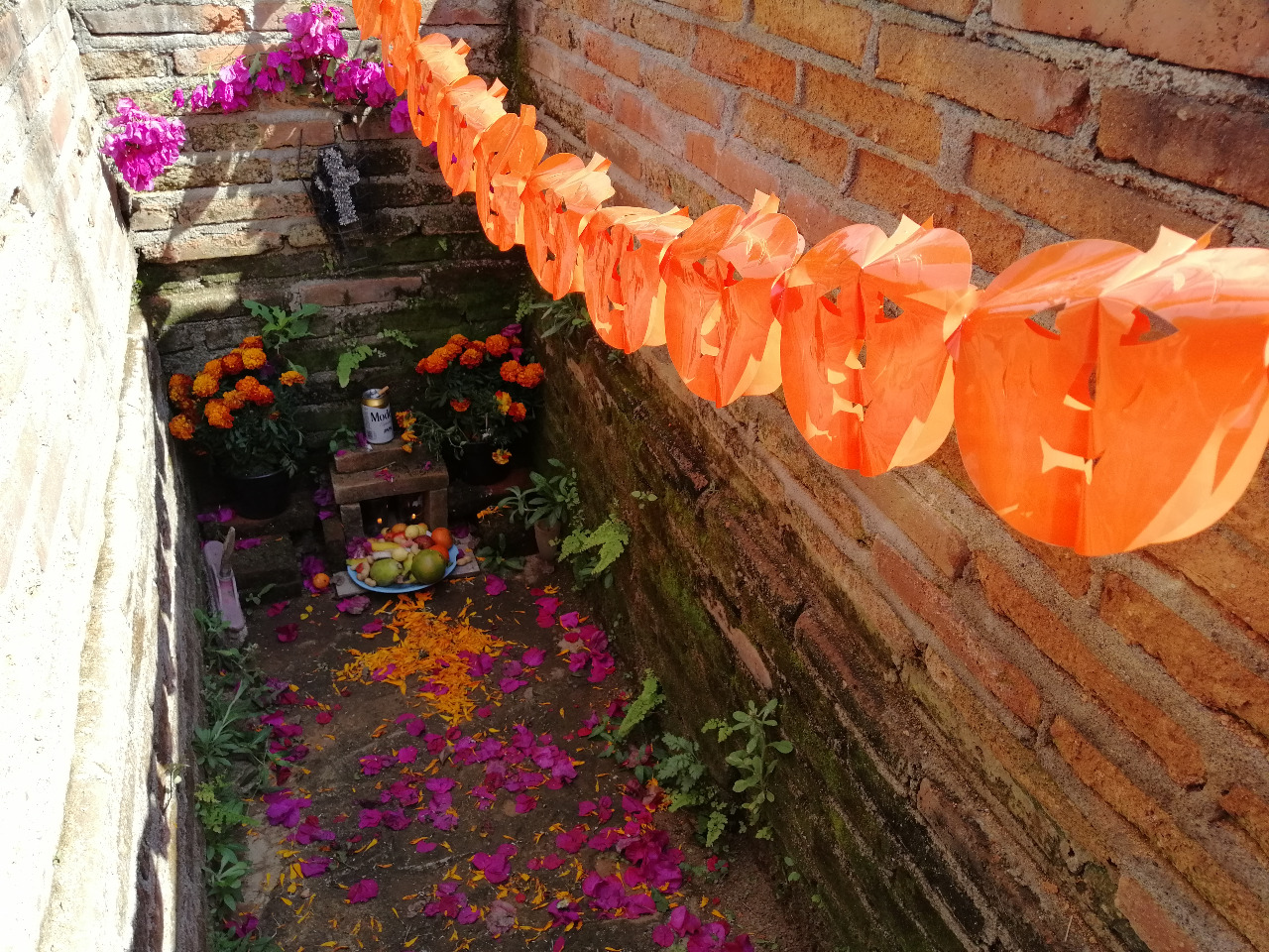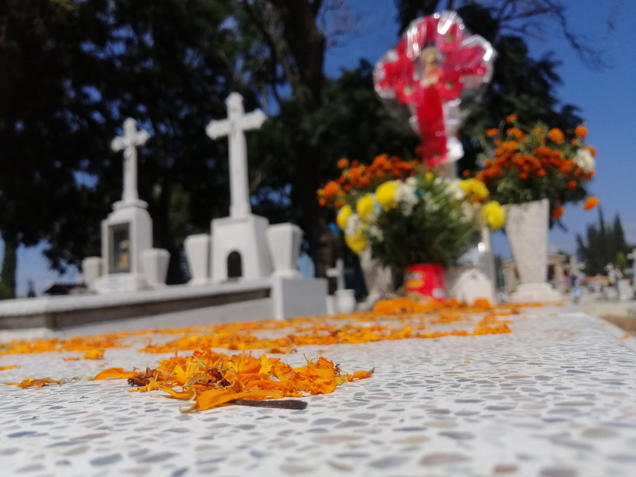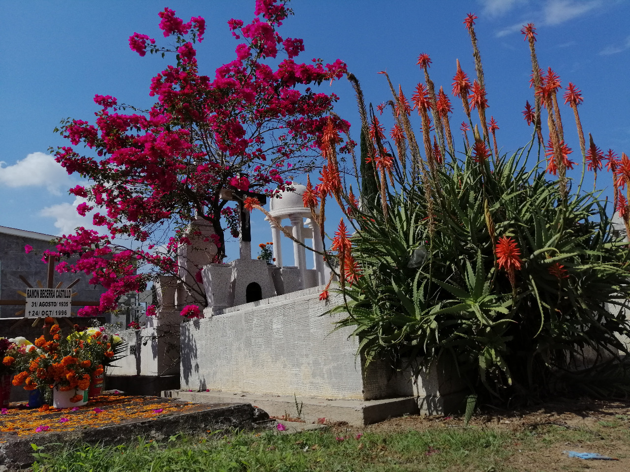 Esta ofrenda reflejaba de manera particular las tradiciones en torno al día de muertos, con flores colocadas en masetas, hojas de cempasúchil sobre la tumba y una cruz tradicional