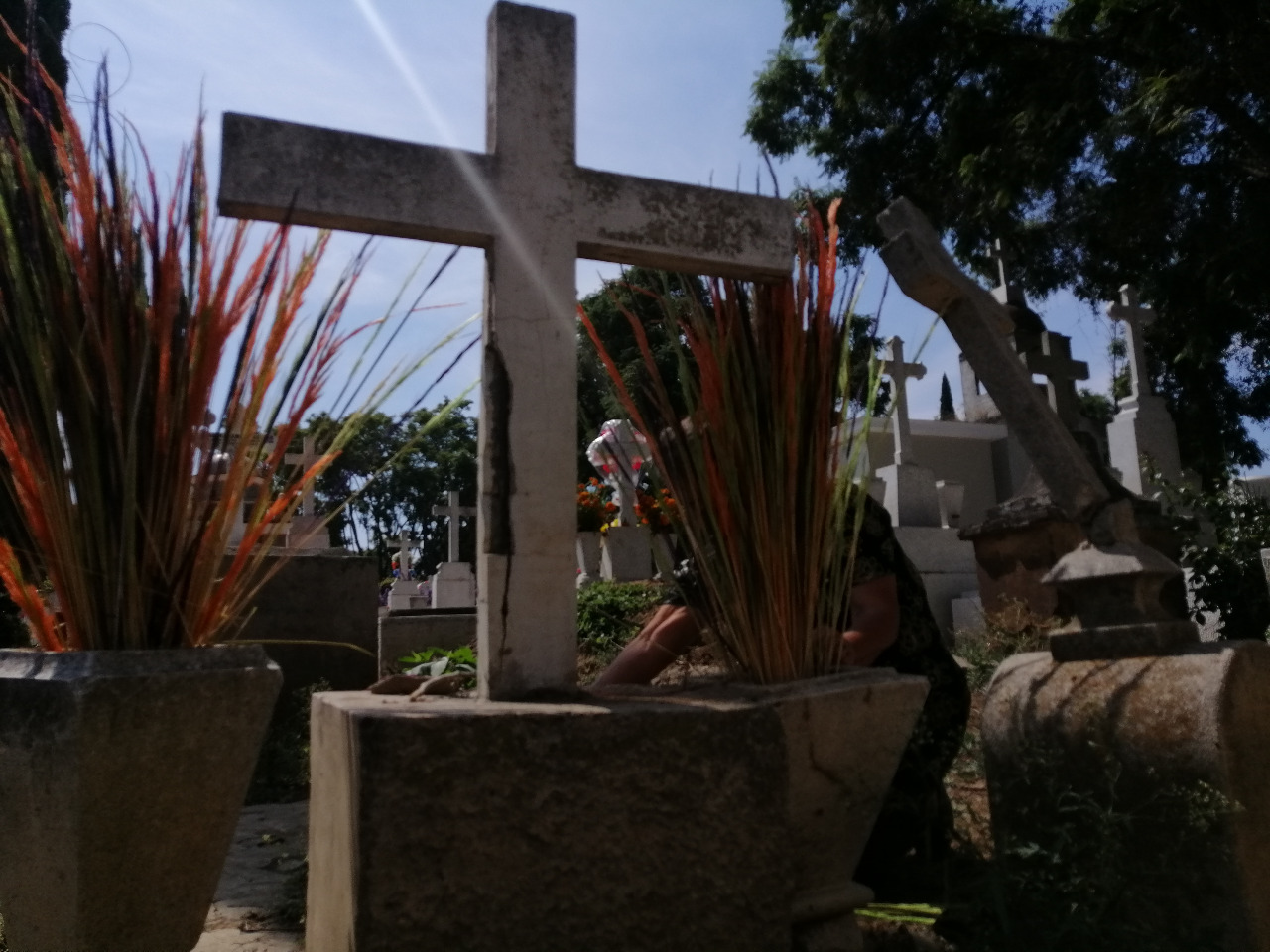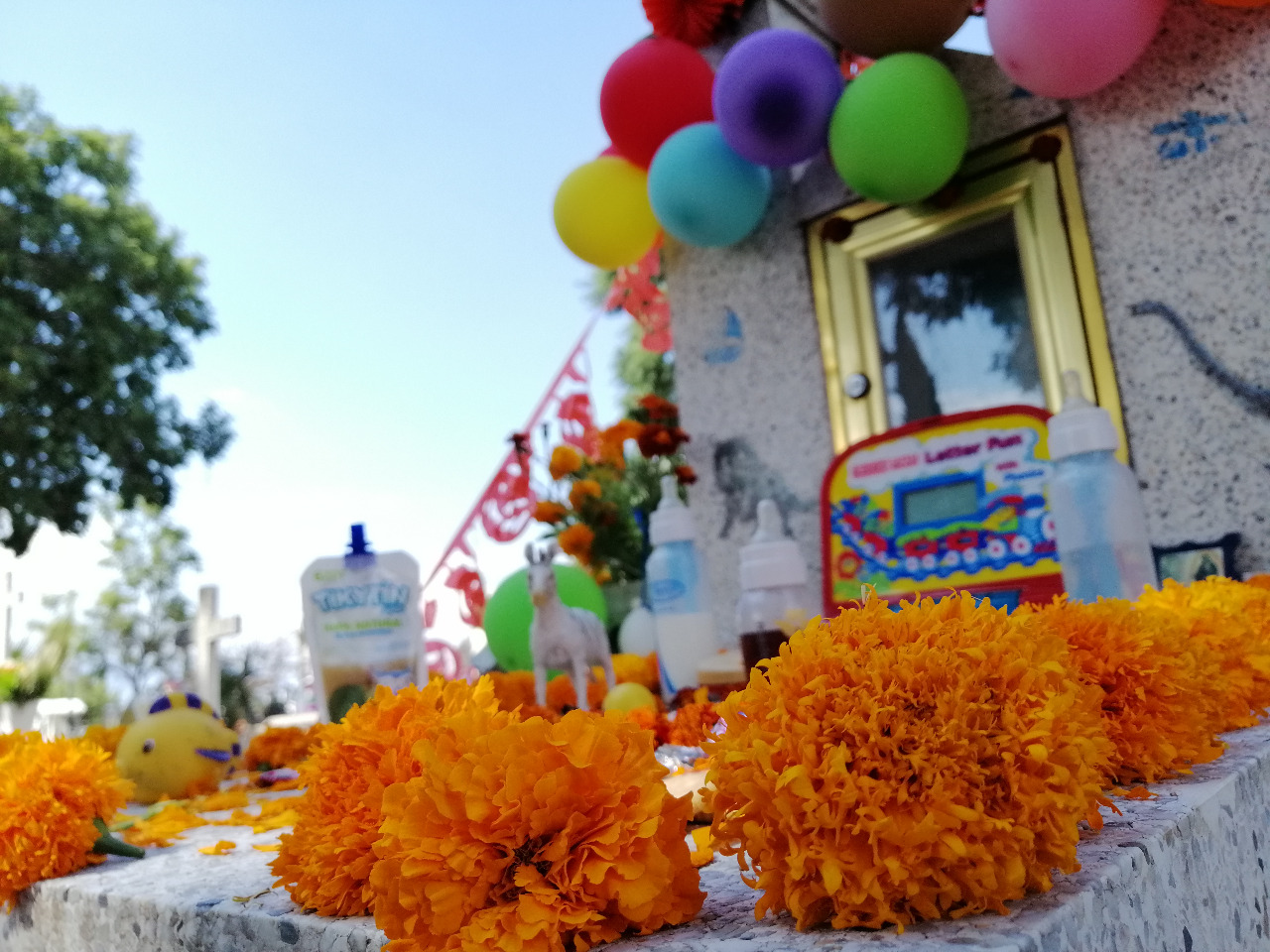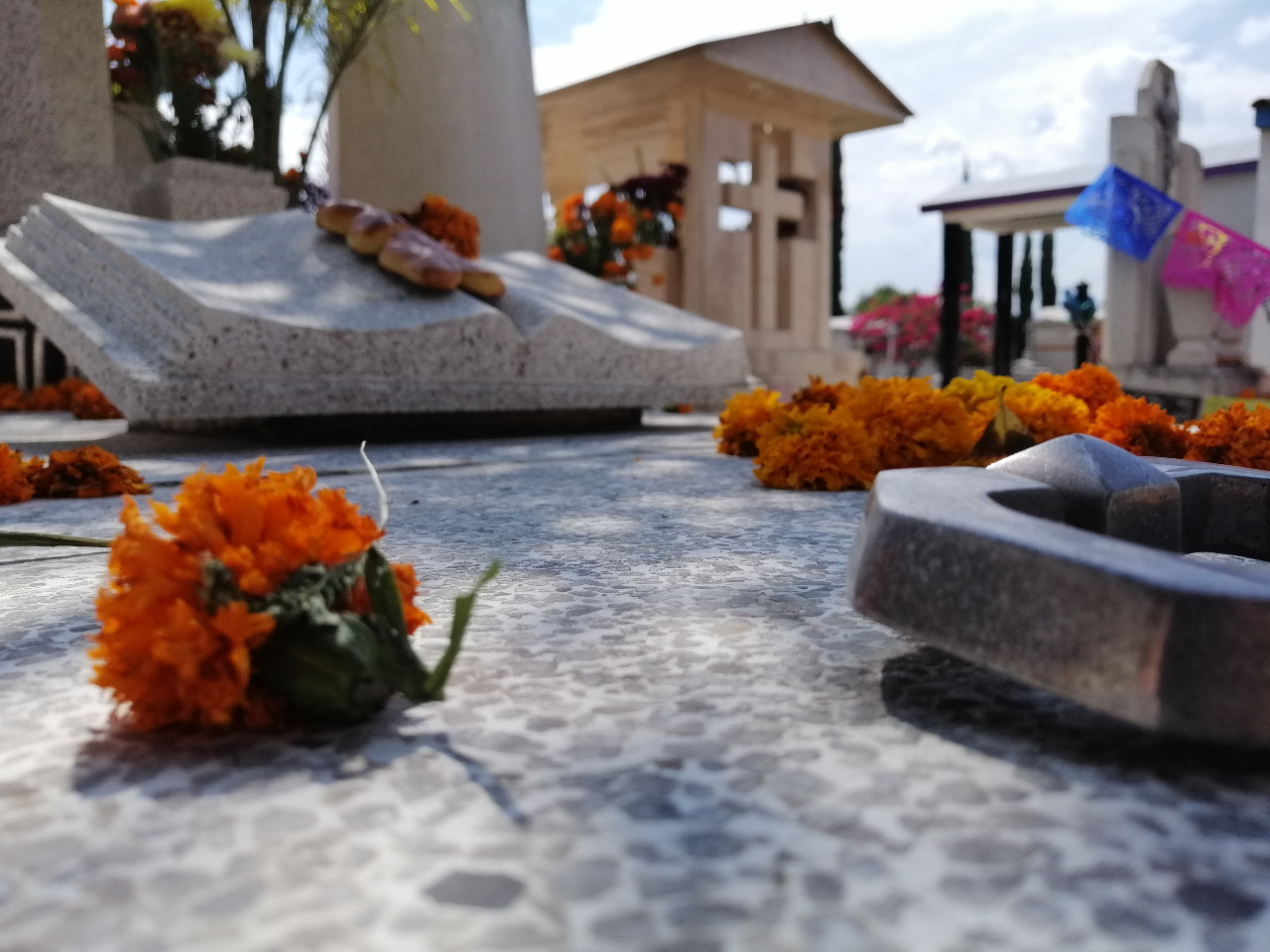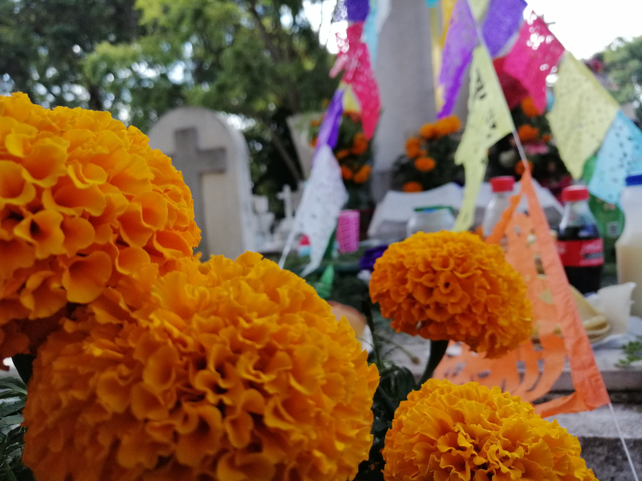 Esta ofrenda reflejaba de manera particular las tradiciones en torno al día de muertos, con flores colocadas en masetas, hojas de cempasúchil sobre la tumba y una cruz tradicional