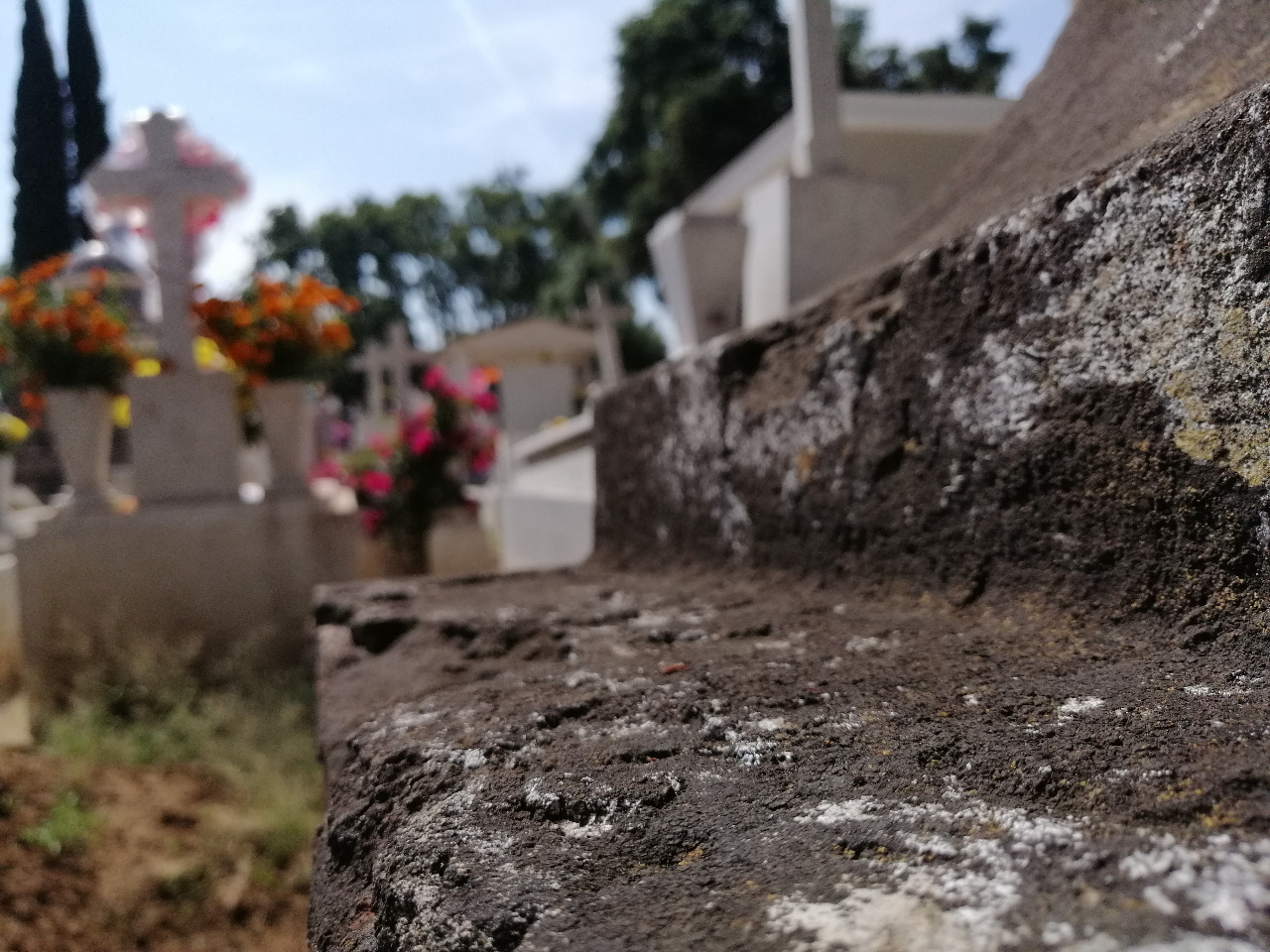 Parte de una tumba colocada en 1918, junto a otras tumbas más recientes. Estoesto es un rasgo común de este cementerio, tumbas del siglo pasado junto a tumbas recientes. No hay división por épocas, ahí el espacio es repartido por igual