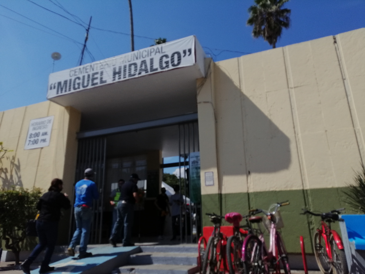 Entrada al cementerio municipal “Miguel Hidalgo. Al ingresar, había personal que proporcionaba gel antibacterial y se aseguraba de que todos los asistentes portaran el cubrebocas correctamente. Los empleados rotaban turno cada cierto tiempo. A pesar de la hora, había visitantes y vendedores en las afueras del lugar