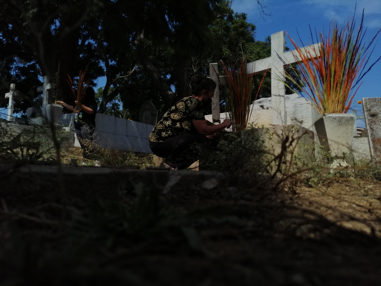 Parte de la tradición de acudir al cementerio el día de muertos es para limpiar las tumbas donde descansan los difuntos. Es lo que hace esta señora. Después de un año de confinamiento, pudo volver a visitar a su madre, padre y hermano