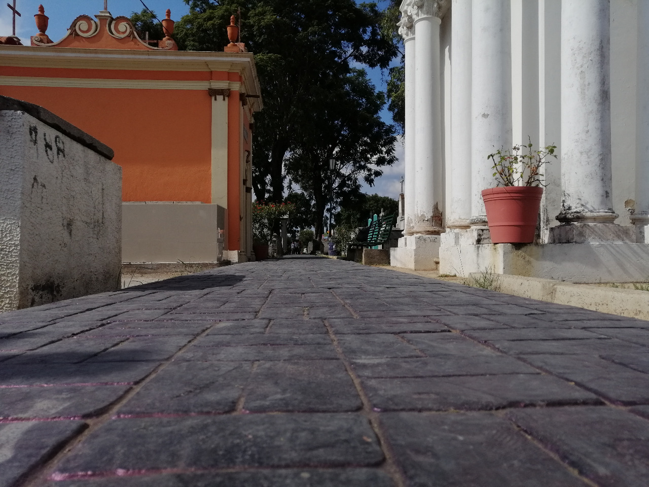 Este es uno de los caminos alternos del cementerio municipal. Es diferente por su piso color negro. No es tan transitado. Este camino pasa por una tumba llamativa y tal vez la más alta de todo el cementerio, que puede servir como punto de ubicación a los visitantes