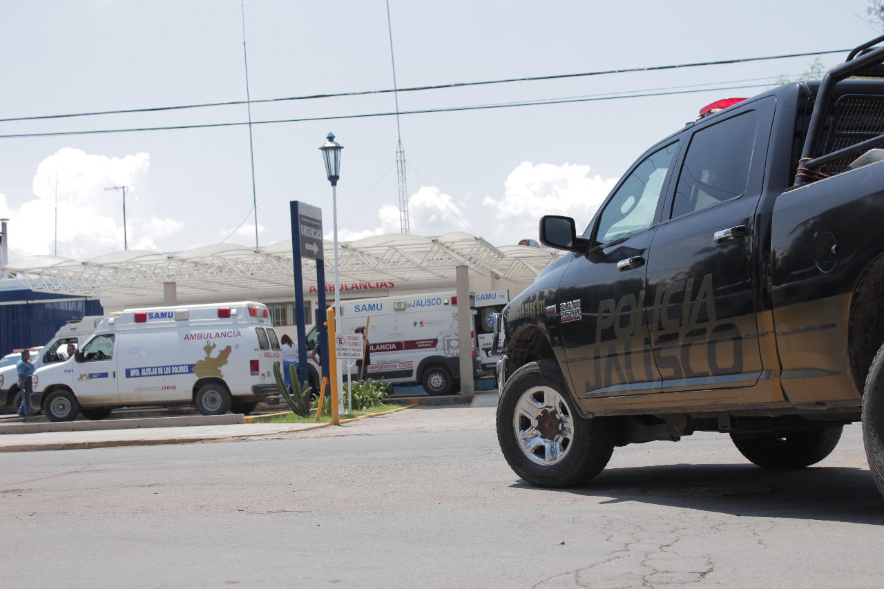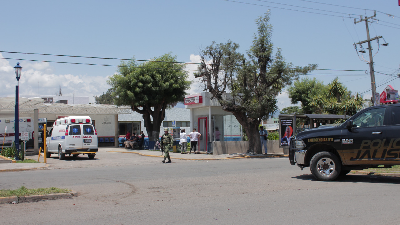 Autoridades montan operativo fuera del hospital regional de Ciudad Guzmán. Se presume atienden a lesionados de enfrentamiento armado en Tepalcatepec, Michoacán.