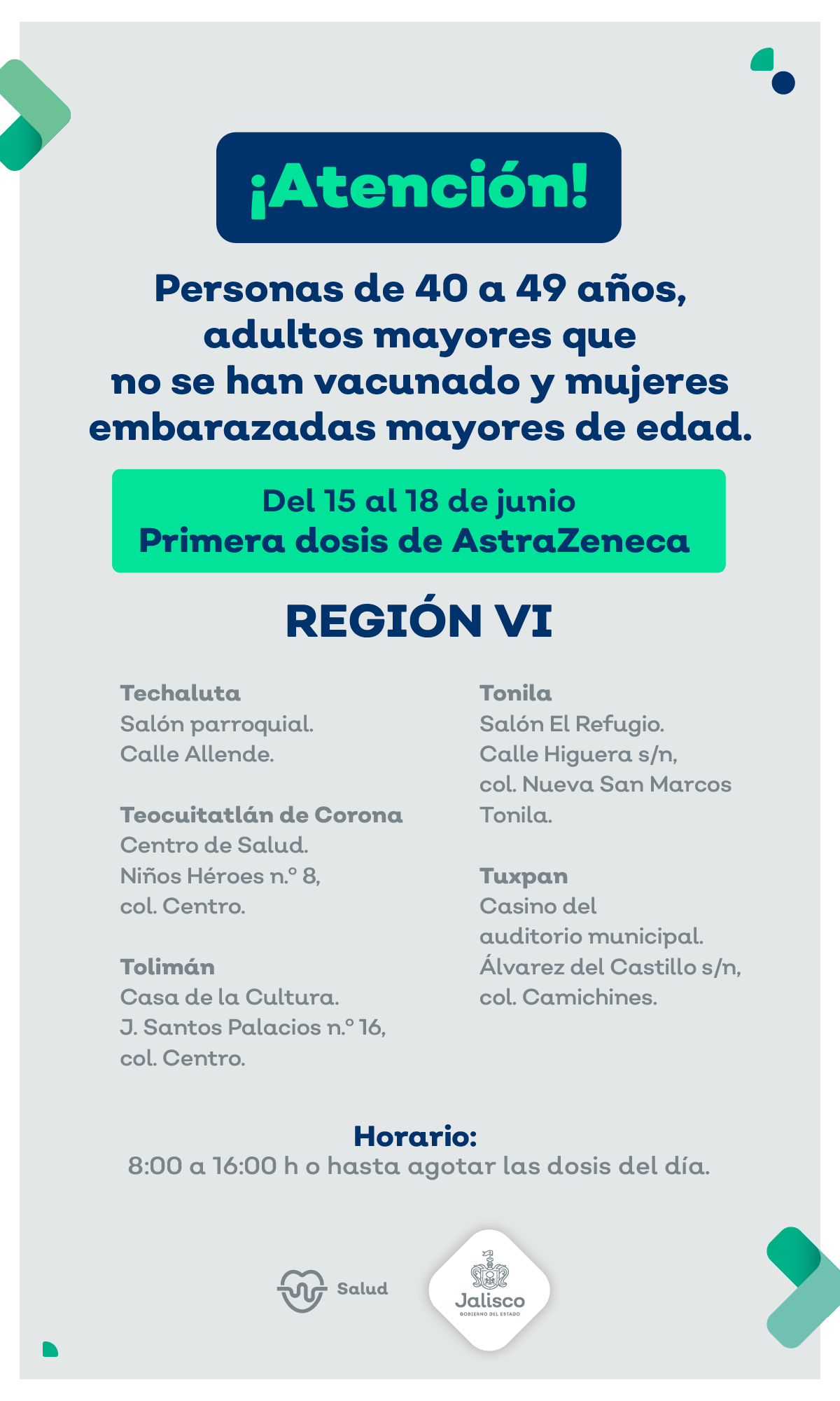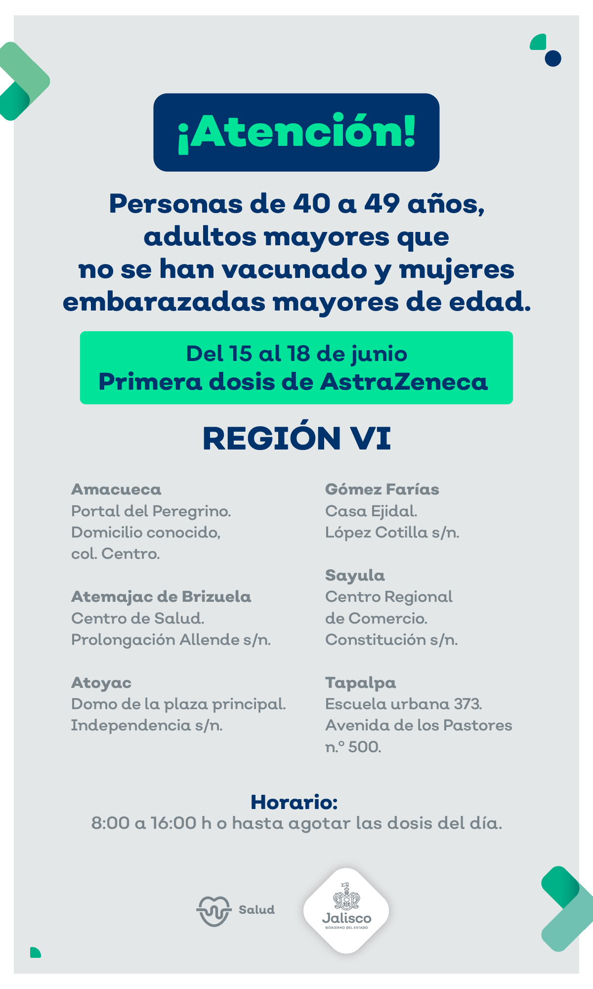 La Secretaría de Salud Jalisco (SSJ) informó que también podrán acudir los adultos de entre 50 a 59 años y mayores de 60 que quedaron rezagados cuando les tocó a su grupo de edad. Sin embargo, puntualizó que serán solo primeras dosis.