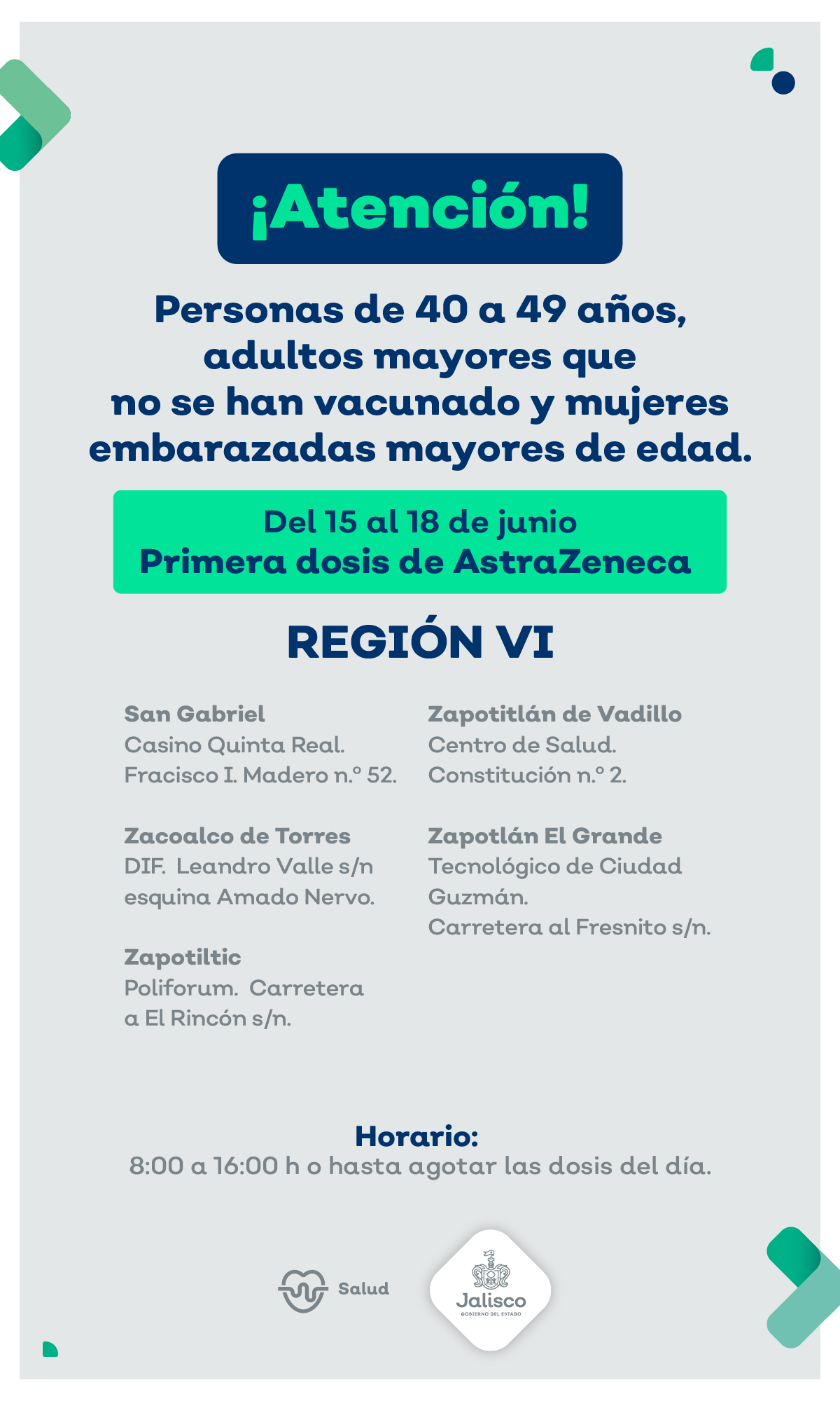 Los municipios beneficiados son Zapotlán el Grande, Zapotiltic, Tuxpan, Tonila, Amacueca, Atemajac, Atoyac, Gómez Farías, Sayula, Tapalpa, Techaluta, Teocuitatlán, Tolimán, San Gabriel y Zacoalco. A diferencia de la vacunación a adultos de 50 a 59 años, en esta etapa no habrá macromódulo regional y se regresará a la implementación de módulos municipales.